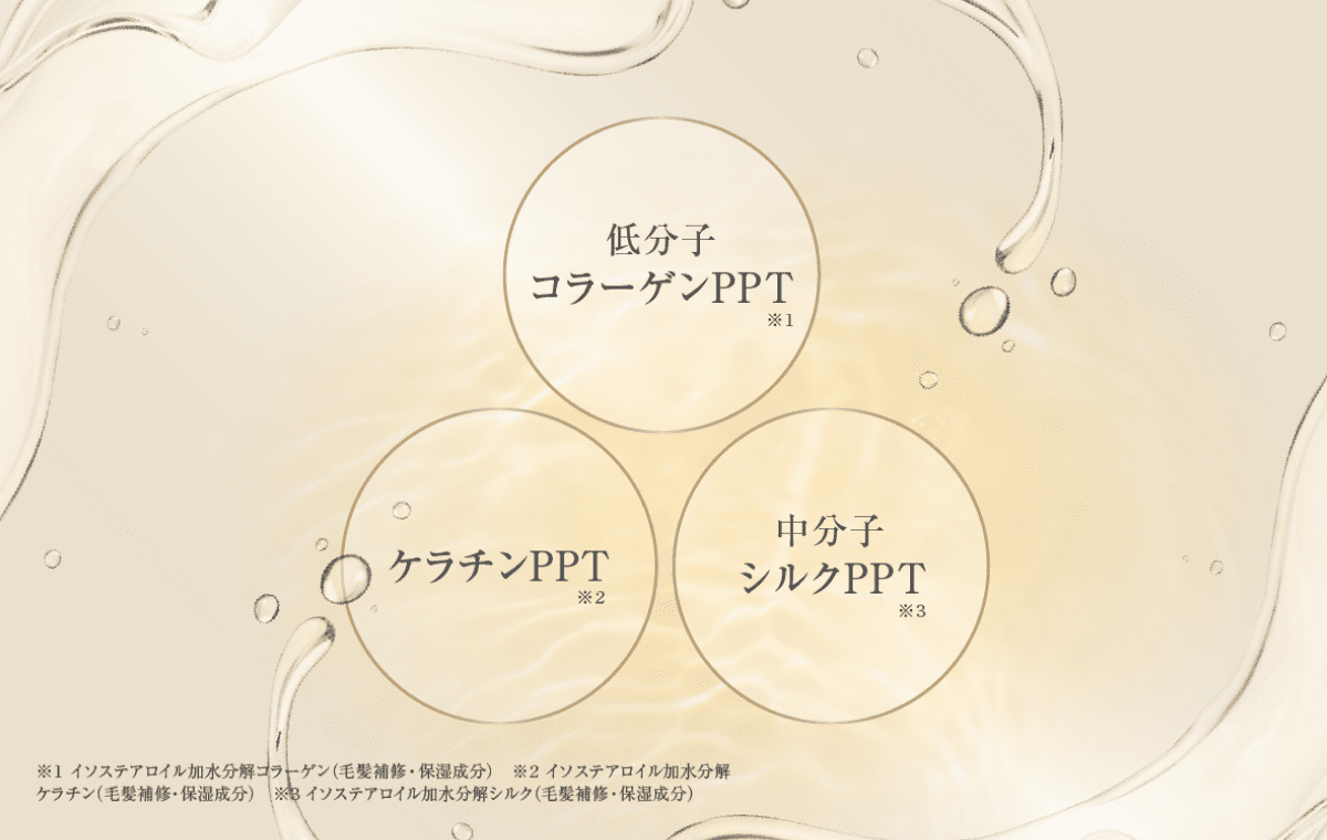低分子コラーゲンPPT※1、ケラチンPPT※2、中分子シルクPPT※3